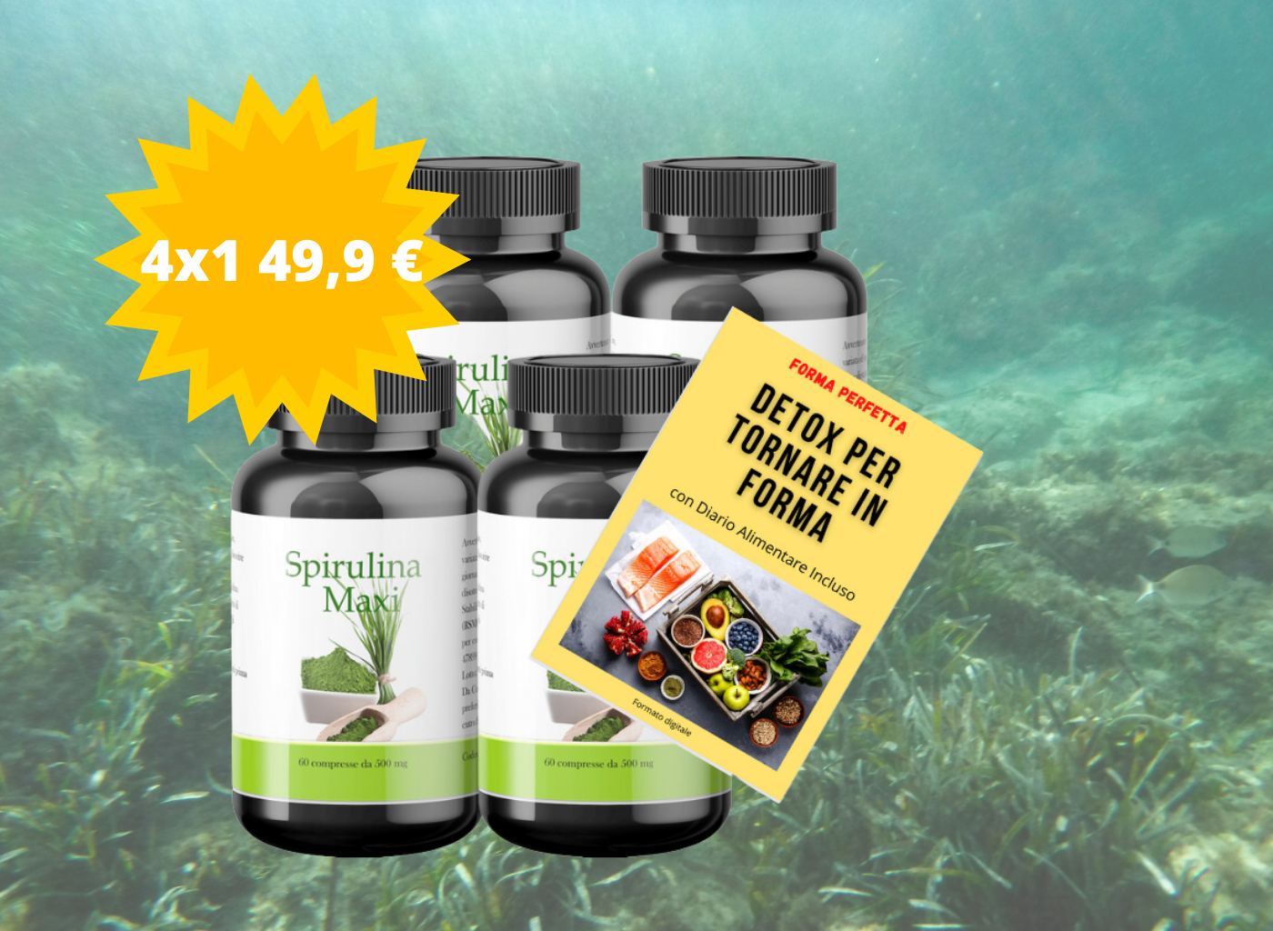 L’offerta contiene 4 confezioni di Spirulina Maxi da 60 compresse ciascuna più un diario alimentare in omaggio.